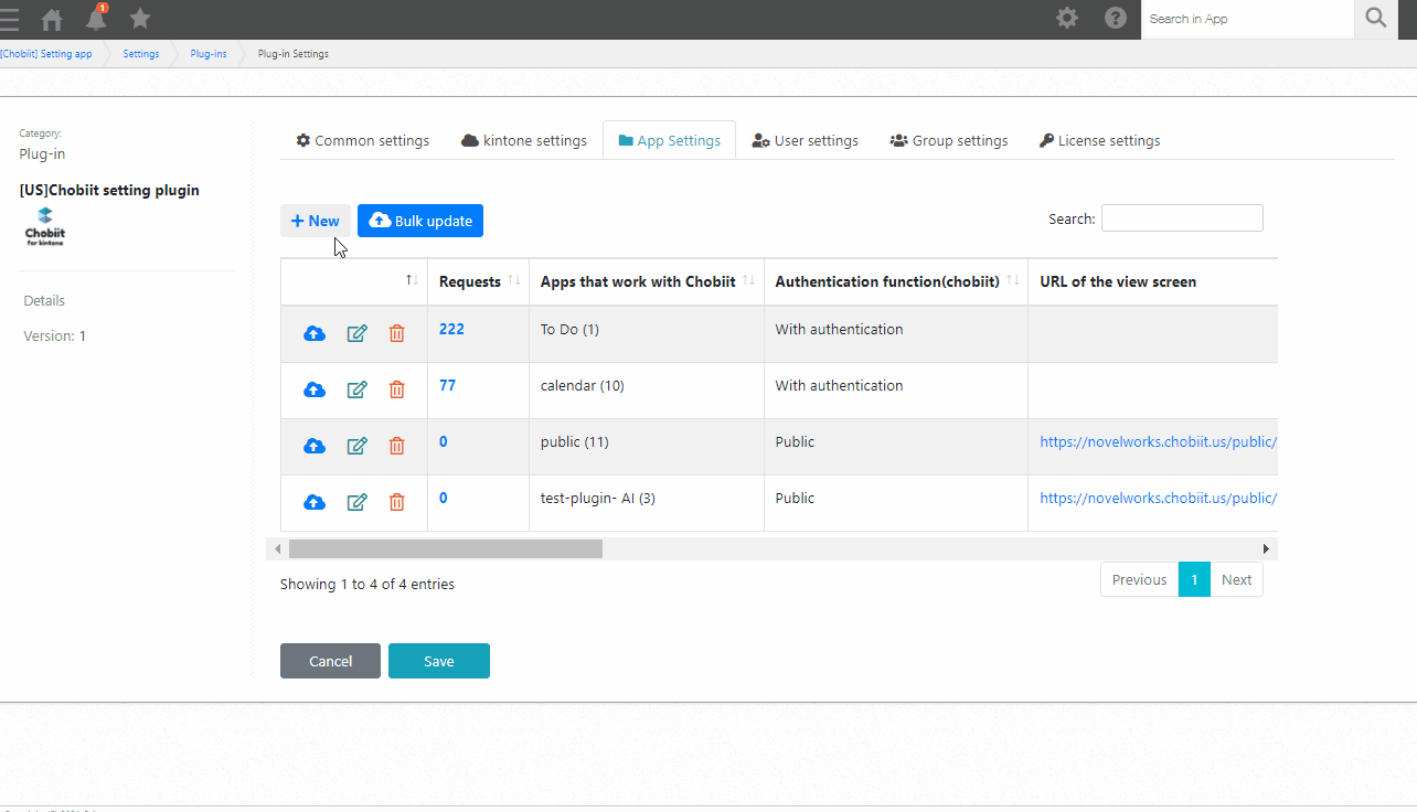 In the Chobiit plug-in settings, navigate to the “App Settings” tab. Click the “+ New” button. Search for the app to be shared in the search field.