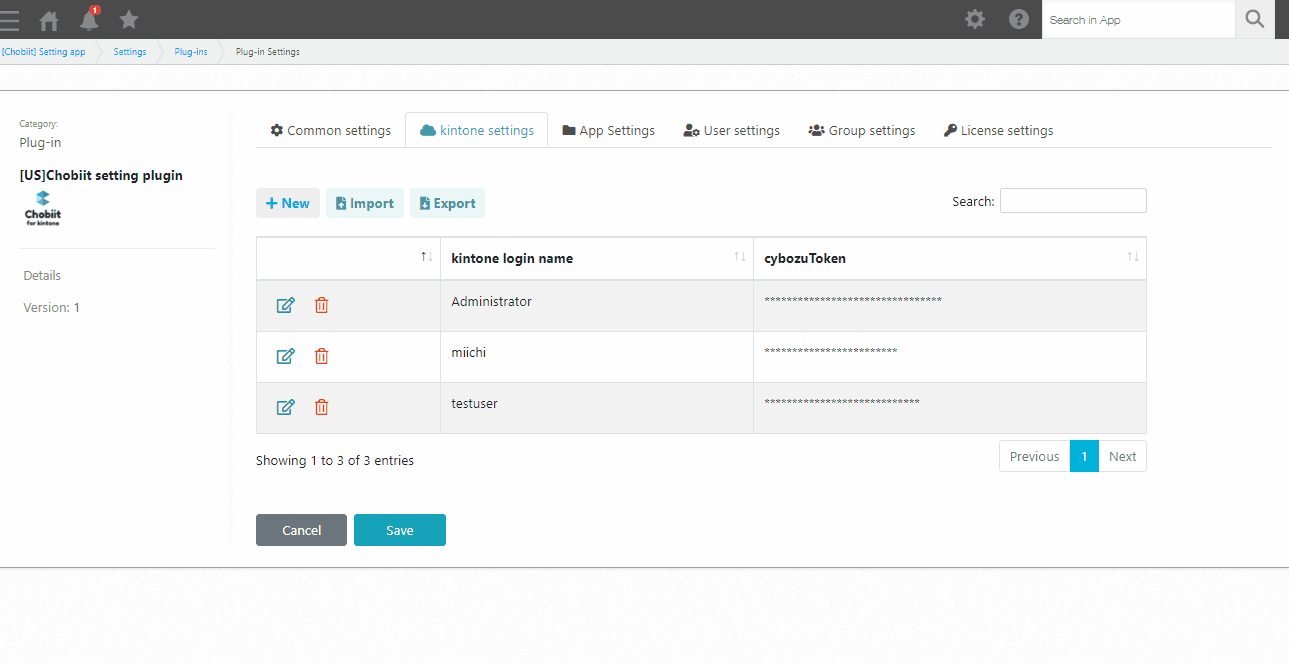 Note that the linked Kintone account must not be using Two-factor authentication. Also note that if the password of the linked Kintone account is changed, the password registered in the Chobiit plug-in settings must also be updated.